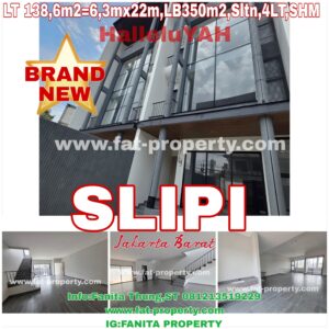 BRAND NEW! Dijual Rukan Jumbo di Jalan Anggrek Garuda, Slipi, Jakarta Barat, Ukuran 6,3 m x 22 m, LB 350 m2, Selatan, SHM, Tingkat 4 Lantai