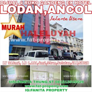 Dijual 4 ruko gandeng di Lodan, Ancol, Jakarta Utara. MURAH! Dulu dipakai sebagai hotel. LT 310m2, LB 1.181,4m2 Tingkat 4 lantai Terdiri dari 39 kamar Ada lift dan tangga Hadap Selatan SHGB Lokasi di dalam komplek ruko dan pergudangan dekat Kampus Universitas Bunda Mulia dan asrama UBM. Dekat pintu tol. Dekat pusat perbelanjaan Mangga Dua … [Read more…]