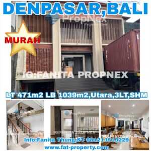 Dijual gedung 3 lantai di Jl Bypass Ngurah Rai, Denpasar,Bali. MURAH! Luas tanah 471m2 Luas bangunan 1039m2. Tingkat 3 lantai. Hadap Utara. SHM Sekarang dipakai sbg kantor dan gudang expedisi. Strategis di jln raya 4 jalur. Hanya 8km(17menit) ke Airport Ngurah Rai, Hanya 4km(8menit) ke Pelabuhan Benoa, Hanya 10km(30menit)ke ktr Gubernur Bali Harga murah Rp … [Read more…]