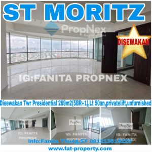 Disewakan Apartment ST MORITZ Tower Presidential the best unit in the best tower: ukuran 269m2. MURAH! Wow view super keren 180°! Di lantai 50an spt junior penthouse. Terdiri dari: – 5 kamar tidur – 5 kamar mandi, -living room dgn view melengkung 180 derajat , -dining room -dapur bersih dan dapur kotor, -kamar pembantu, -kamar … [Read more…]